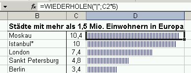 Mit Ms-Excel oder OpenOffice Calc lassen sich solche Grafiken mit der Funktion =WIEDERHOLEN() auf einfacher Art erstellen. Dabei werden zwei Parameter übergeben: das zu wiederholende Zeichen hier ein senkrechter Strich („|“) und die Anzahl der Wiederholungen hier der Zellenbezug.